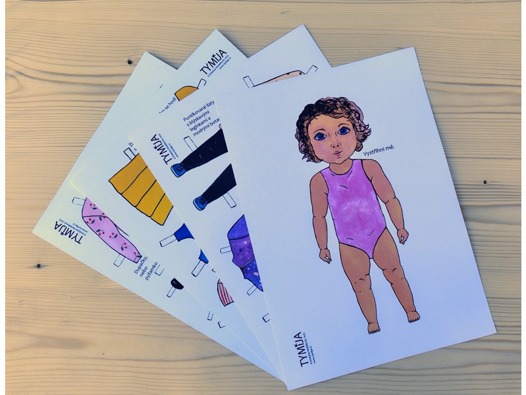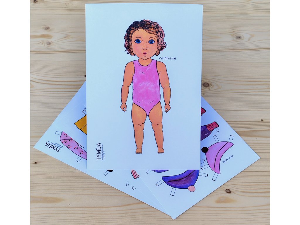 Vystřihovánka Tymija pro rozvíjení jemné motoriky a fantazie. Panenka a její oblečení jsou po vystřižení stále docela velké a dobře se s tím vším manipuluje. V sadě oblečení jsou k vystřižení i boty, které jsou malé a na obléknutí náročnější.