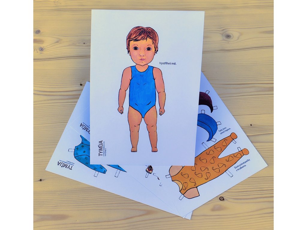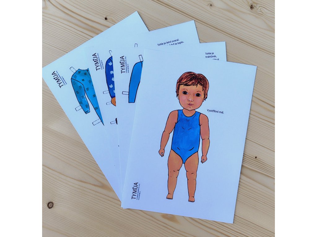 Vystřihovánka Tymija pro rozvíjení jemné motoriky a fantazie. Panáček a jeho oblečení jsou po vystřižení stále docela velké a dobře se s tím vším manipuluje. V sadě oblečení jsou k vystřižení i boty, které jsou malé a na obléknutí náročnější.